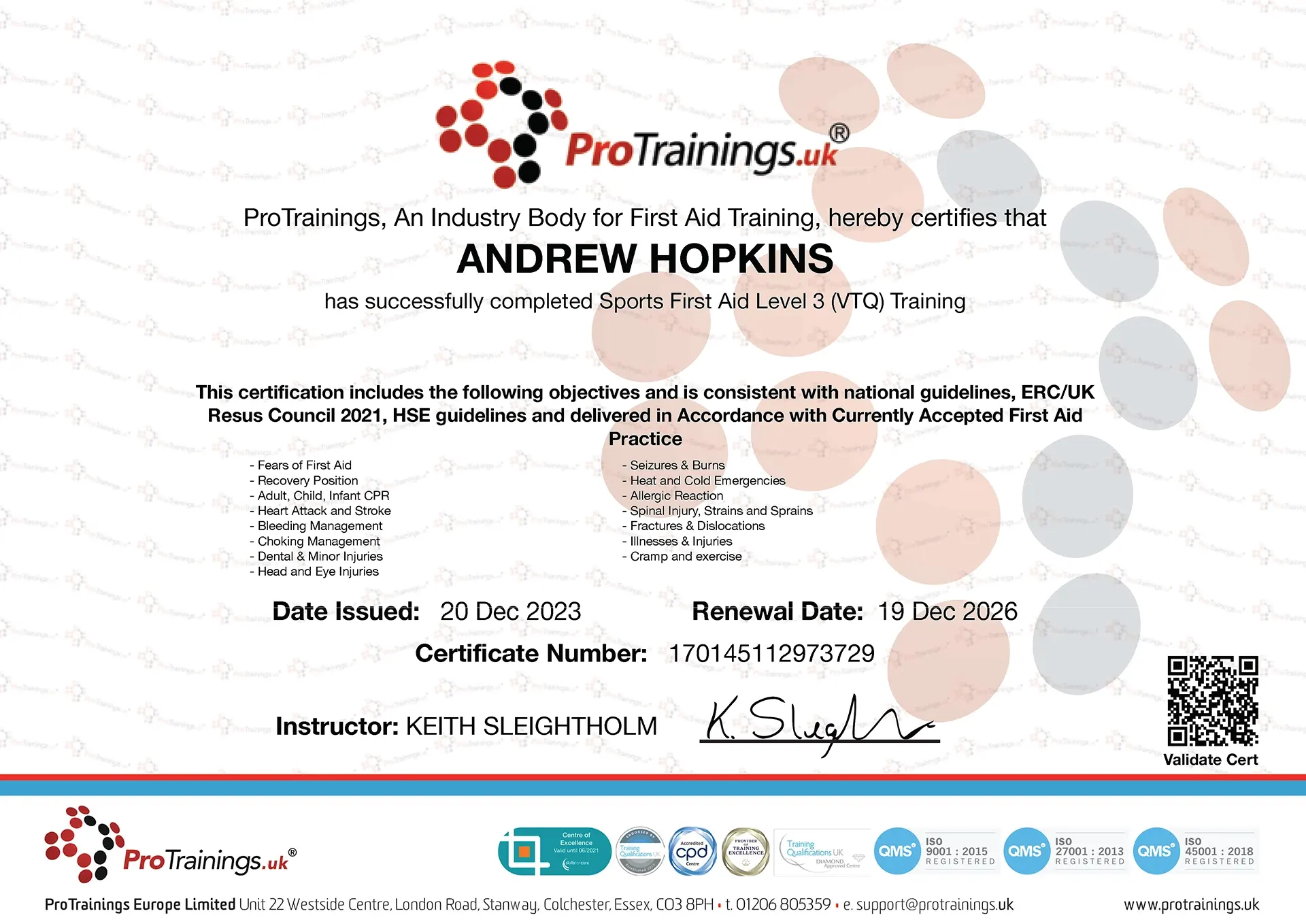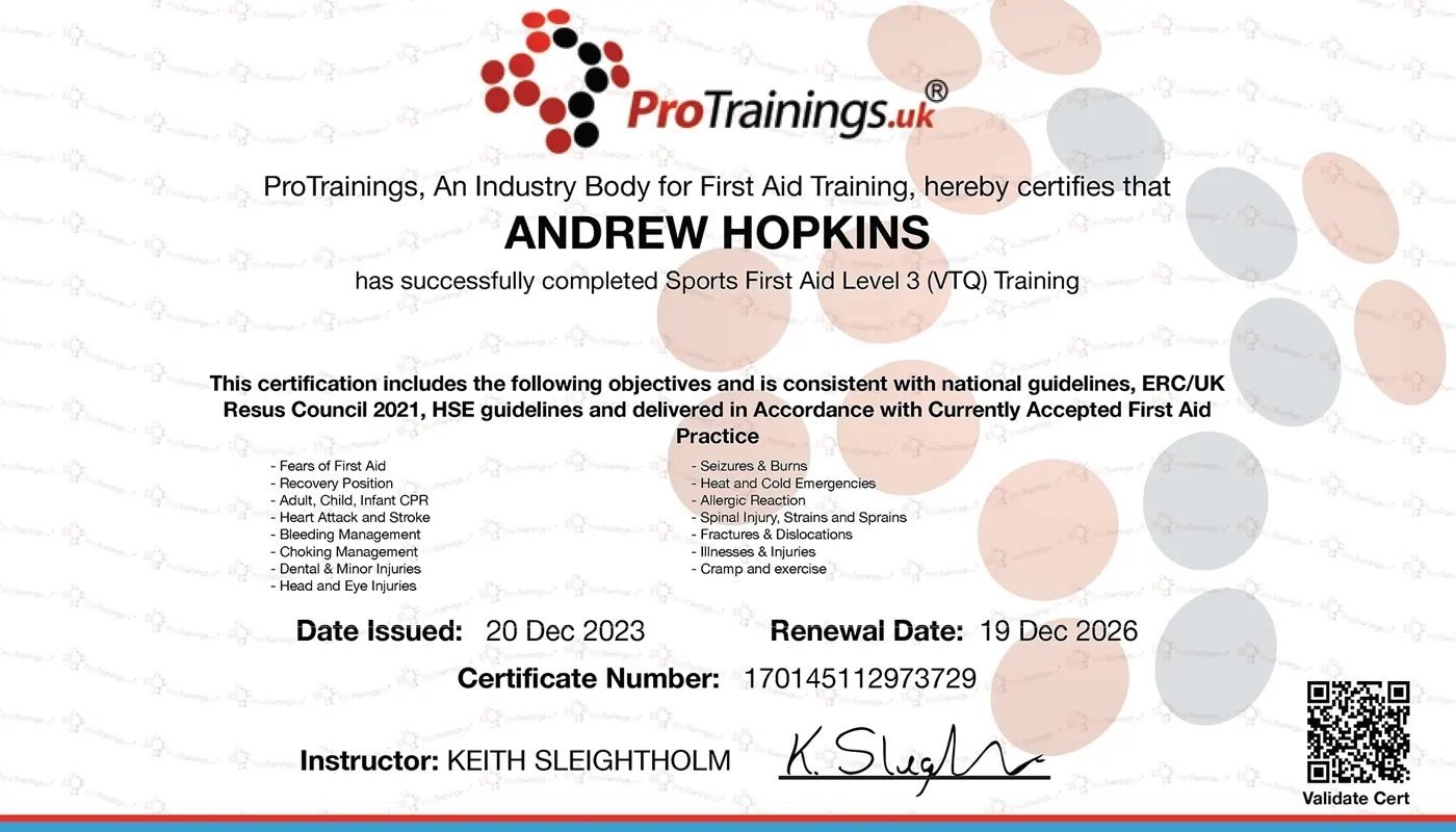 - Sports Level 3 (VTQ) First Aid Training – Expires 19th Dec 2026