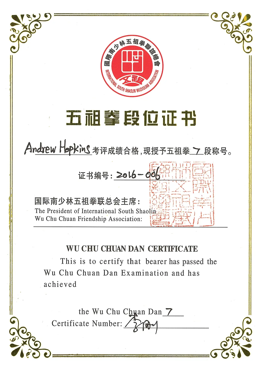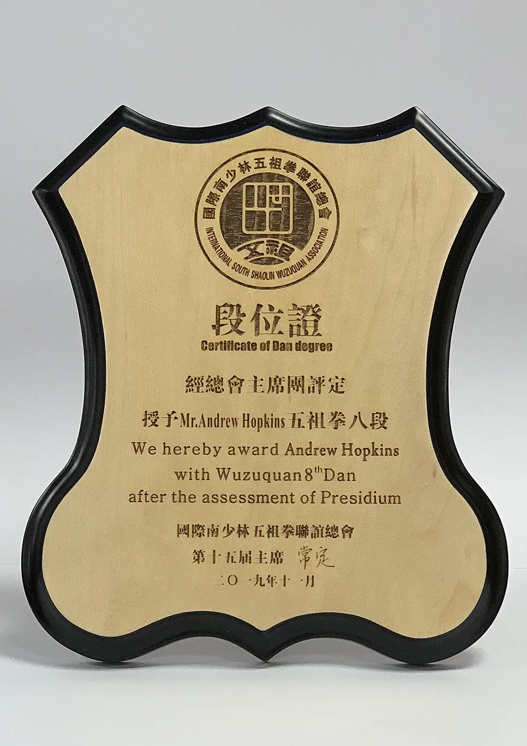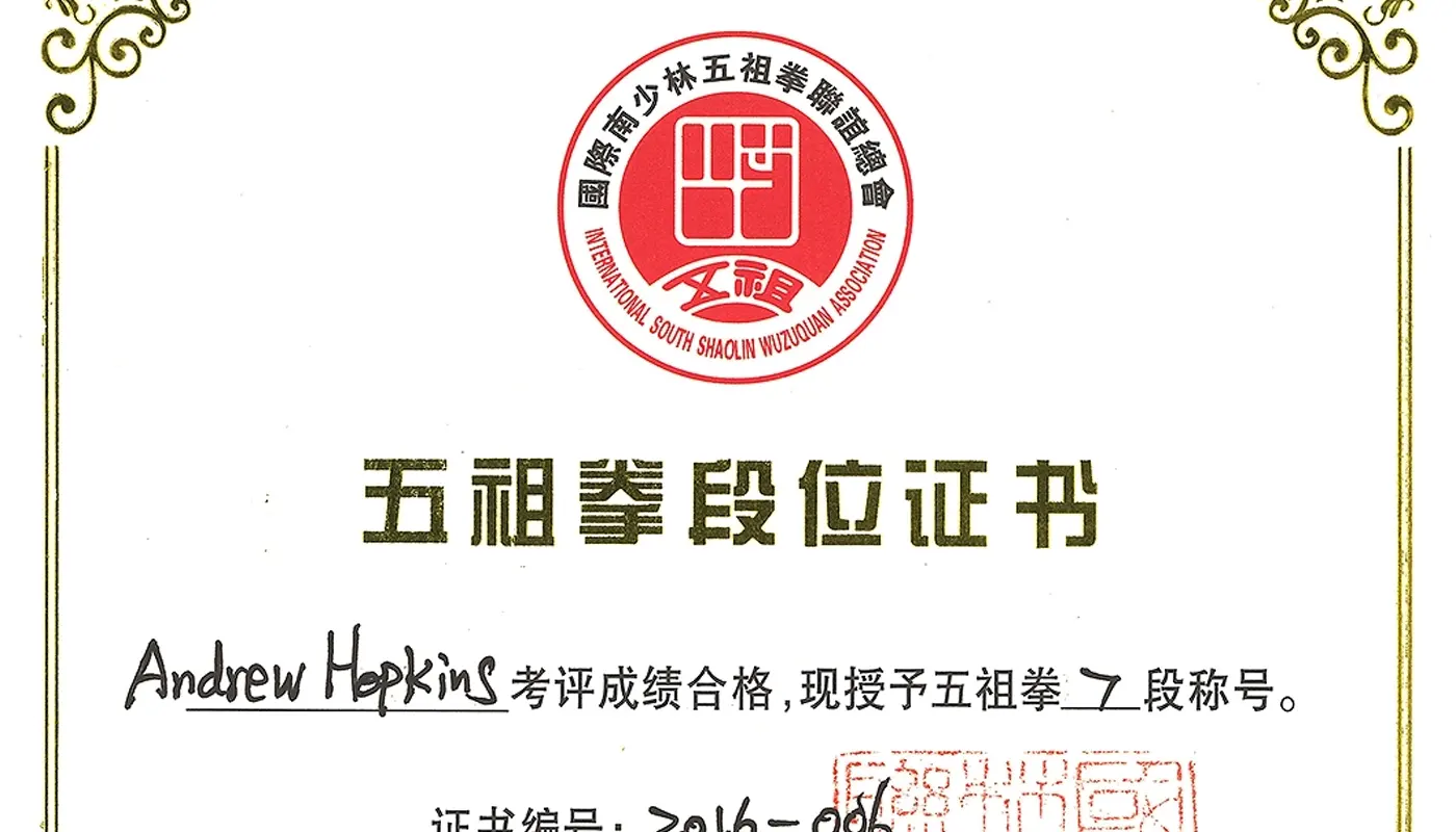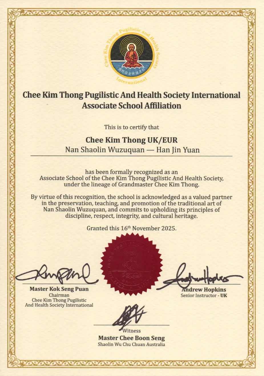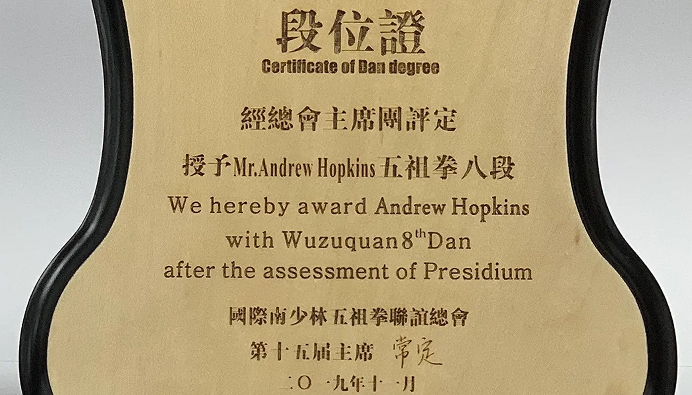 In 2016 I was awarded a 7th Duan Instructor certificate in China, followed by an 8th Duan Instructor award in 2019. My heartfelt aim is to continue to teach and propagate this art so that many more people can benefit from the physical, mental and health properties this art encompasses and to preserve as much of the art as possible for future generations to come. I will endeavour to be deserving of the certificates I have been bestowed and bring this Martial art to a wider audience in the spirit of openness, friendship and teaching.